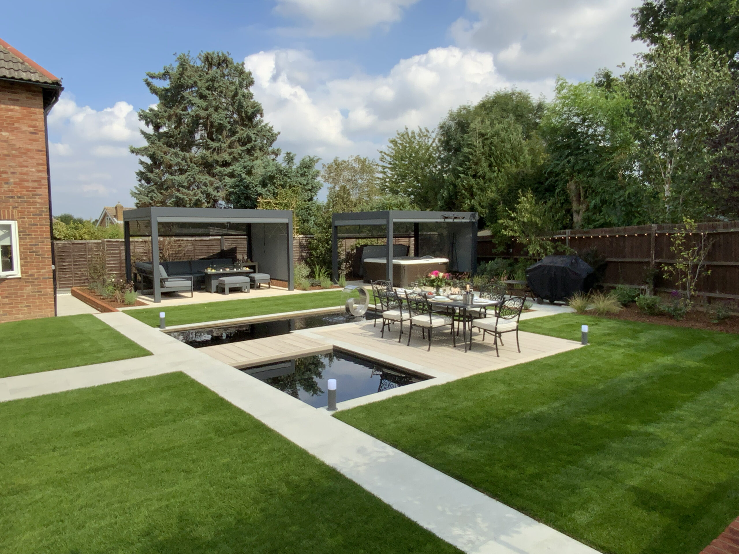 In order to achieve this, several key features were incorporated into the design. For the main dining space, a central decked area was constructed and accessed by a bridge, which was surrounded by a water pool. The paving links the area for easy access to both the kitchen and outdoor BBQ cooking area.